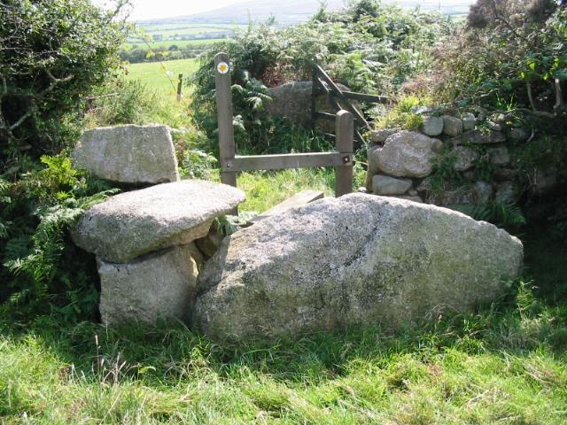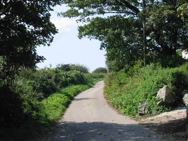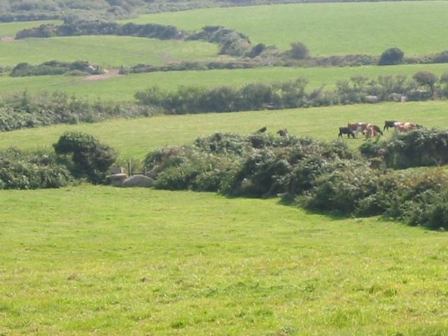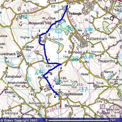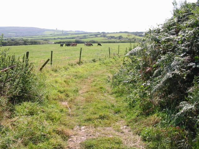 This is the route favoured by the Reporting Team. As you will see there are a number of alternatives. Right, I assume that you have managed to find the little road next to Hellesveor Church that takes you up past one side of Rosewall Hill [1 on map]. Propel thyself hence down that road, past Bussow Reservoir and up the hill. About half way up the climb you will come across a junctionlet on your left. You are looking for a public footpath on that side. This is not it. Time to make like the cows (and the crowd at Woodstock) and take to the grass. |