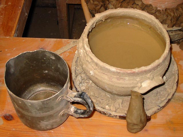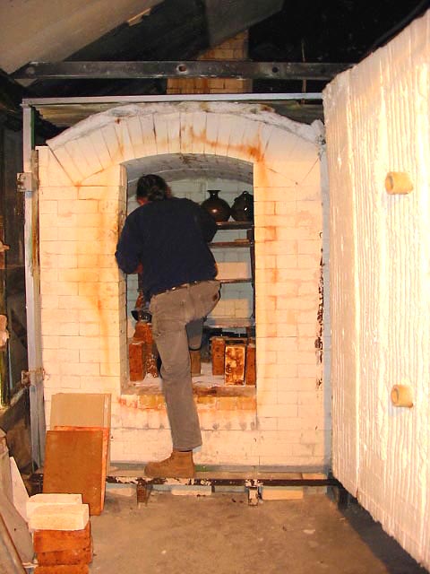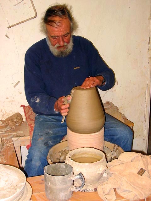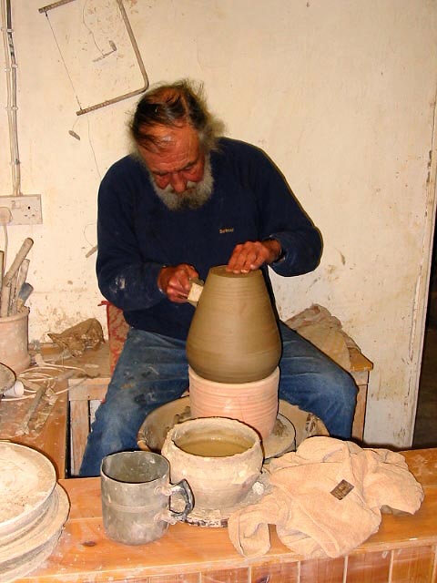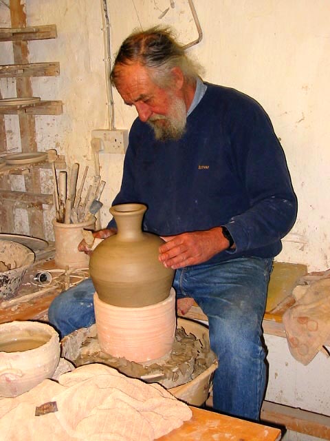 Well, a big 'ta' to Trev for letting the Reporting Team rampage around the Leach Pottery to make this feature. So, I think it's only fair that we sign off with the man himself ... Trevor Corser was born in the past and currently lives in the present. He was originally from deepest, darkest Oldham in the frozen North and originally came to St. Ives as a fisherman. This proved to be a sensible move as Oldham is nowhere near the sea and you wouldn't want to keep anything that you caught in the Manchester Ship Canal! Trev first started in the Leach as a kiln stacker in the 60's and learned his trade under the glare of the maestro himself. When Bernard Leach popped his clogs in 1979, Mother Leach decided to abandon the production of standard domestic ware and booted out most of the students who kept the assembly lines rolling. She kept Trev on, though, and from then on they concentrated on producing 'one-off' studio pieces for the international collectors' market. Trev spends most days at the pottery turning out whatever he damn well pleases and his work is internationally sought after. (And he gave me one of his pieces, so 'yah, boo, sucks to you!'). When the Tate opened in St. Ives in 1993 Trevor was the first potter to have his work on show in the gallery. You can purchase Trevor's work in the Leach pottery showroom, you can also get some of it from an outfit called Walker Galleries at:- 13 Montpellier Parade, Harrogate, North Yorkshire, HG1 2TJ Phone: 01423 526366 Phax: 01423 525975 E-mail: wgltd@aol.com Website: www.walkerfineart.co.uk When off duty Trevor likes to relax by chilling out to his collection of blues and jazz records, which is currently merely the size of a minor Central American country. He divides his free time between going to odd parts of the world where Janet's (that's THE Janet Penfold, not THE Janet Leach) sprogs have secreted themselves, trying to go where no (English) man has gone before in the Greek islands, winning prizes in the Sloop Meat Draw and failing to understand how 90% of his computer works*.