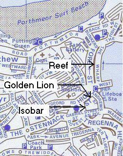 St. Ives street map showing locations of Golden lion, Reef Bar and Isobar.